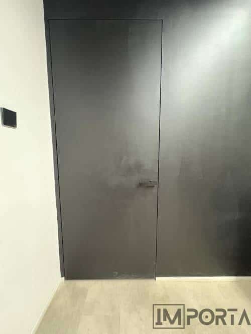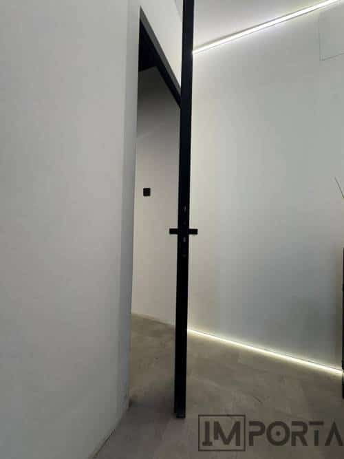 The Black Painted Door with Royal Black Profile by Importa offers a seamless, monochrome finish for ultra-modern interiors. Hidden within the wall yet visually powerful, it combines PU coating and a black aluminum frame for bold sophistication.